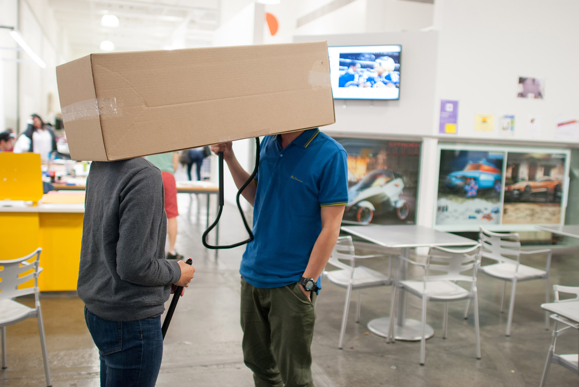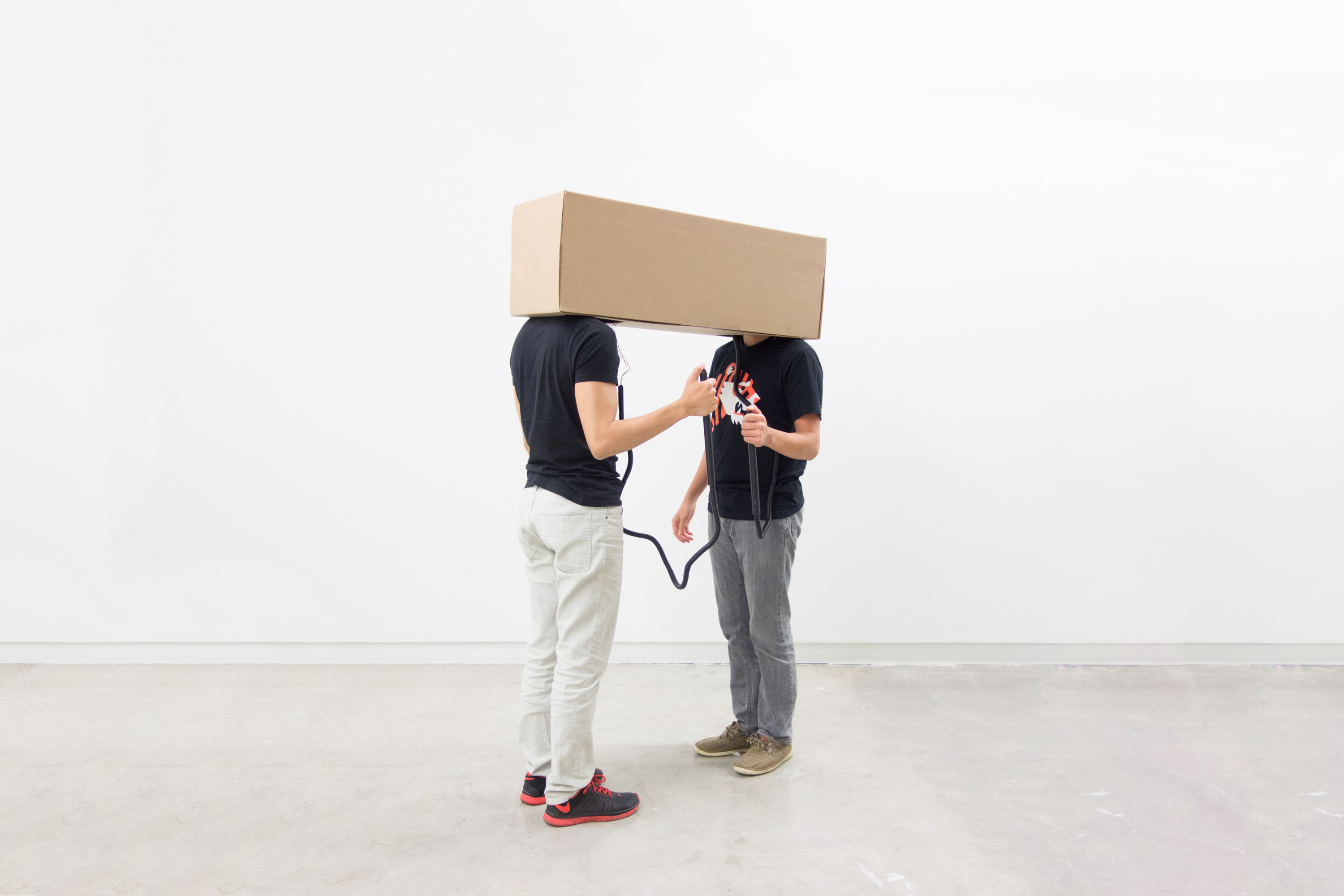 The device is made of a cardboard box and LED lights programmed with Arduino, and users can mount it on their head to enter the "chatroom." After entrance, the users are free to talk to each other without anything happening within the device. However, whenever the users sense awkward silence, they have a choice to "detonate" the box to resolve the situation. Once the device is activated, the device will start playing a top pop hit and LED lighting effects. According to the questionnaires collected afterwards, this device successfully prolongs the conversation and mediates the awkwardness. Moreover, this device works even better when deployed on total strangers.
